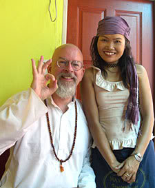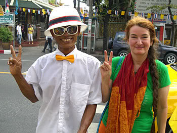 After paying the bill, Tara and I mounted our trusty chariot and I announced to the crowd, “We’re off to India. It’s been wonderful dining with all of you beautiful people at Mai Kaidee’s, the best vegetarian restaurant in Bangkok. May you all experience health, happiness and fulfillment.” Mai exploded in glee, yelled,”Photo, photo,” and ran over to get in the picture. After a few snaps, our trusty charioteer maneuvered through the streets and dropped us off at the river taxi for our final afternoon of sightseeing before returning to India.